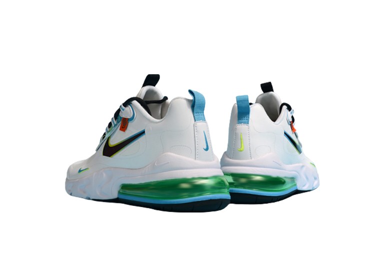 נעלי נייק Nike מדגם Air Max 270 React עם סוליית גומי יחודית בשילוב יחידת אוויר ובולם לריכוך הצעדים. לנעליים בד רשת לאוורור, שרוכי קשירה ולוגו נייקי מופיע על צידי הנעל ומאחור.