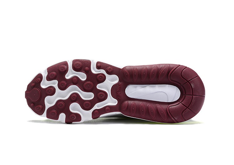 נעלי נייק Nike מדגם Air Max 270 React עם סוליית גומי יחודית בשילוב יחידת אוויר ובולם לריכוך הצעדים. לנעליים בד רשת לאוורור, שרוכי קשירה ולוגו נייקי מופיע על צידי הנעל ומאחור.