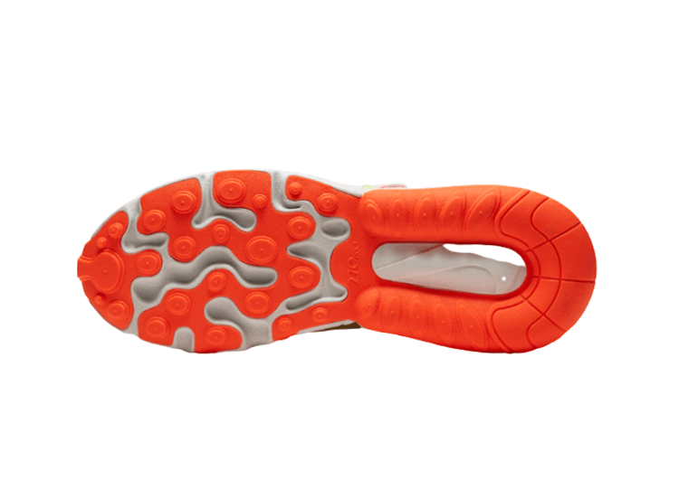 נעלי נייק Nike מדגם Air Max 270 React עם סוליית גומי יחודית בשילוב יחידת אוויר ובולם לריכוך הצעדים. לנעליים בד רשת לאוורור, שרוכי קשירה ולוגו נייקי מופיע על צידי הנעל ומאחור.