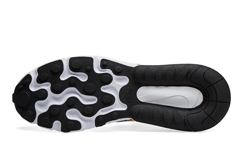 נעלי נייק Nike מדגם Air Max 270 React עם סוליית גומי יחודית בשילוב יחידת אוויר ובולם לריכוך הצעדים. לנעליים בד רשת לאוורור, שרוכי קשירה ולוגו נייקי מופיע על צידי הנעל ומאחור.